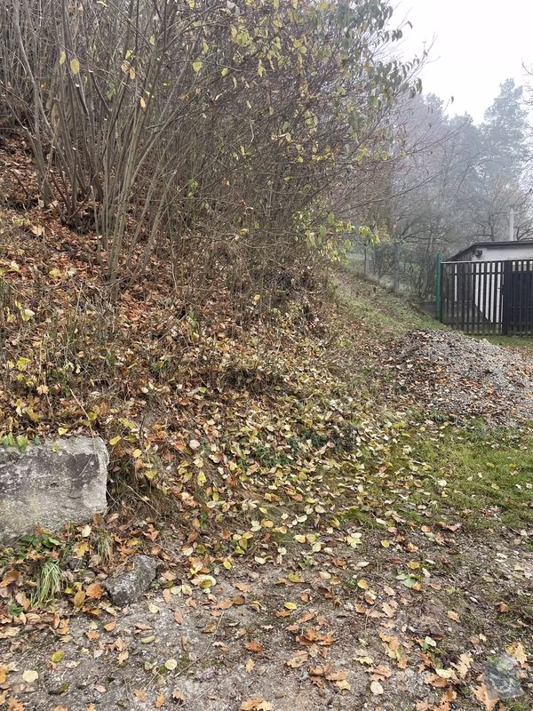 Zídka v mírném svahu o délce 12m z betonových palisád uložených v betonovém základu. Výška nad terén cca 50cm.